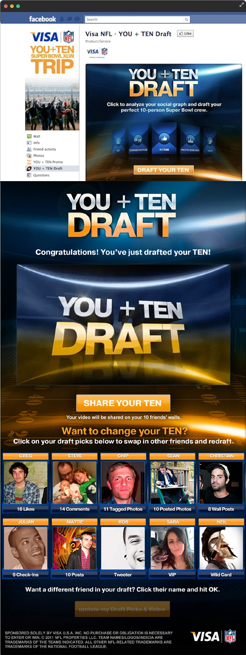 For the digital campaign, the "You+10 Draft," scraped your Facebook Page to analyze your most recent interactions with friends and created a list of your 10 BFFs. A video was created featuring the 10 who were assigned roles like "commentator," "No.